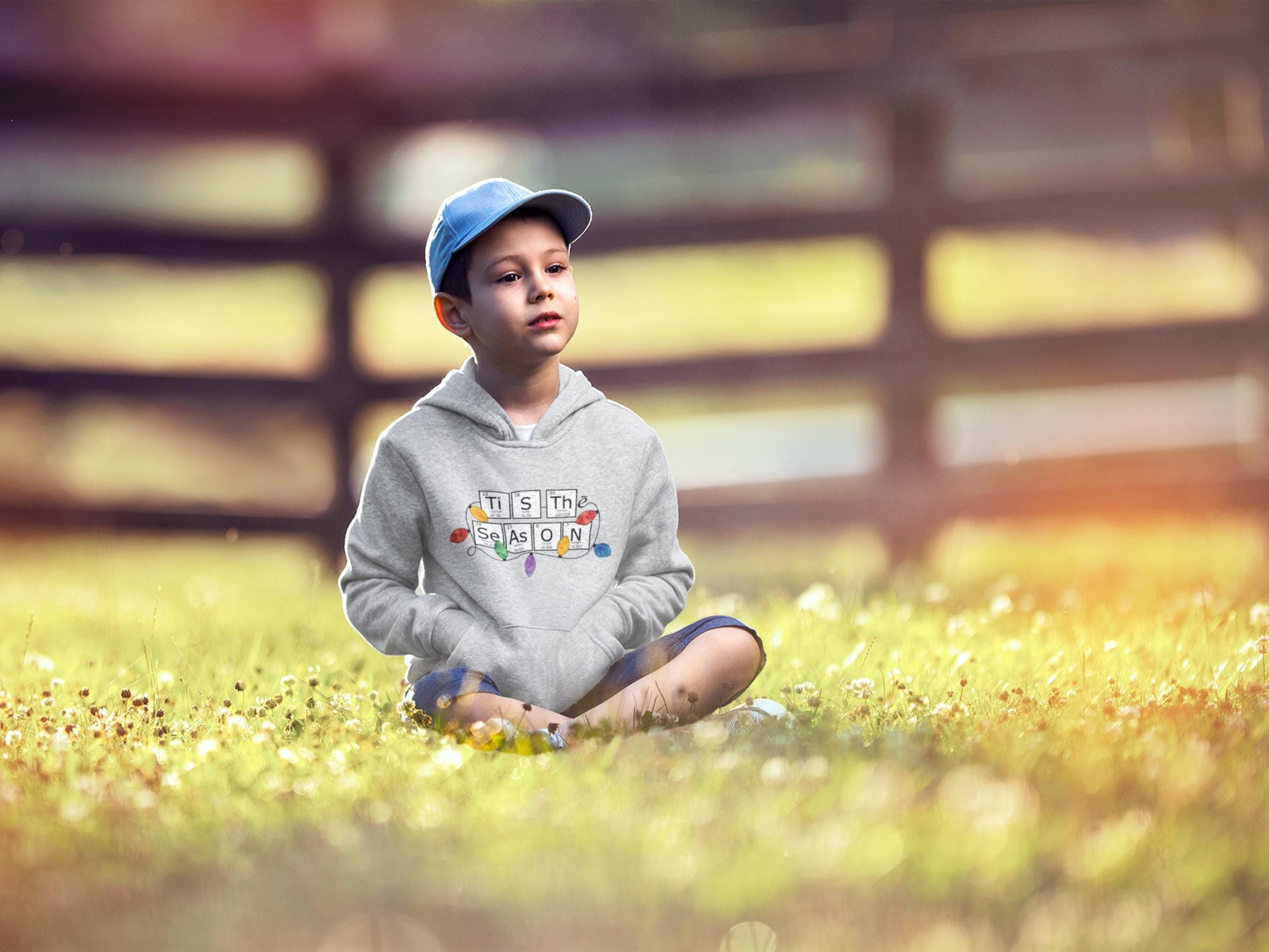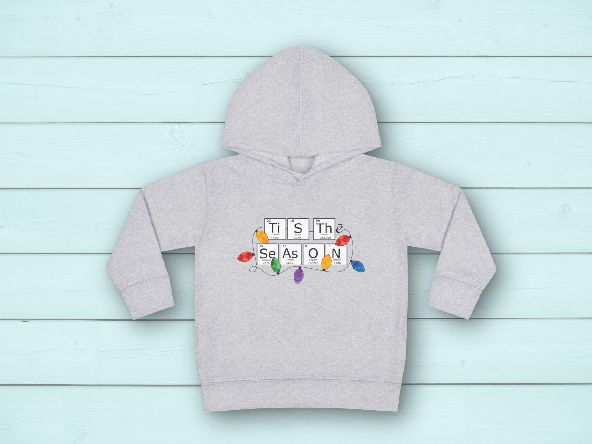 Creative festive holiday sweatshirts are the perfect accessory for your kiddo this winter. This kid-sized holiday sweatshirt takes the fun of the periodic table to spell out “Tis The Season” with some festive flair.