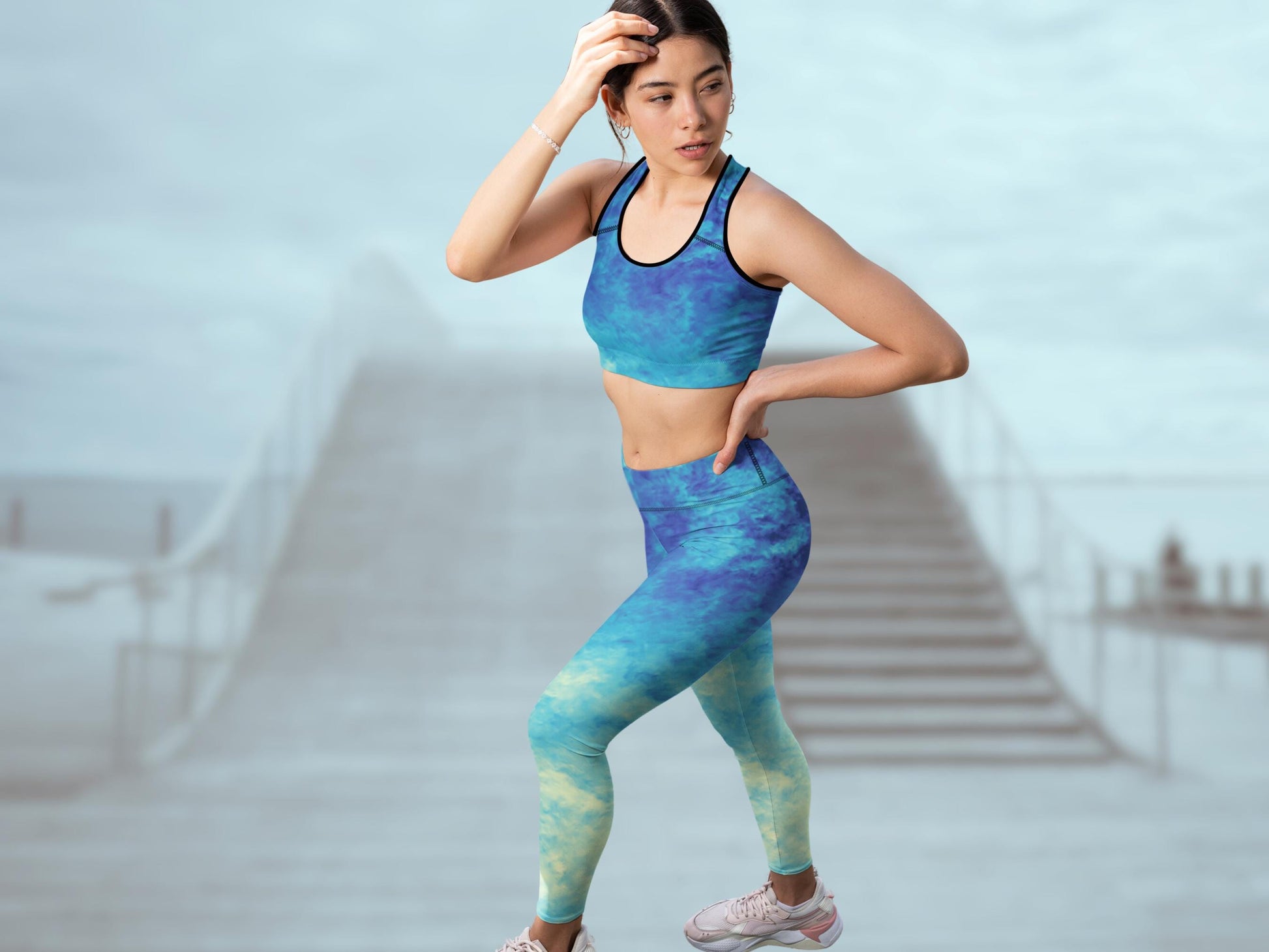 High-waist blue yoga set, digital tie-dye activewear, padded bra and leggings, blue women’s fitness set, stylish workout exercise outfit